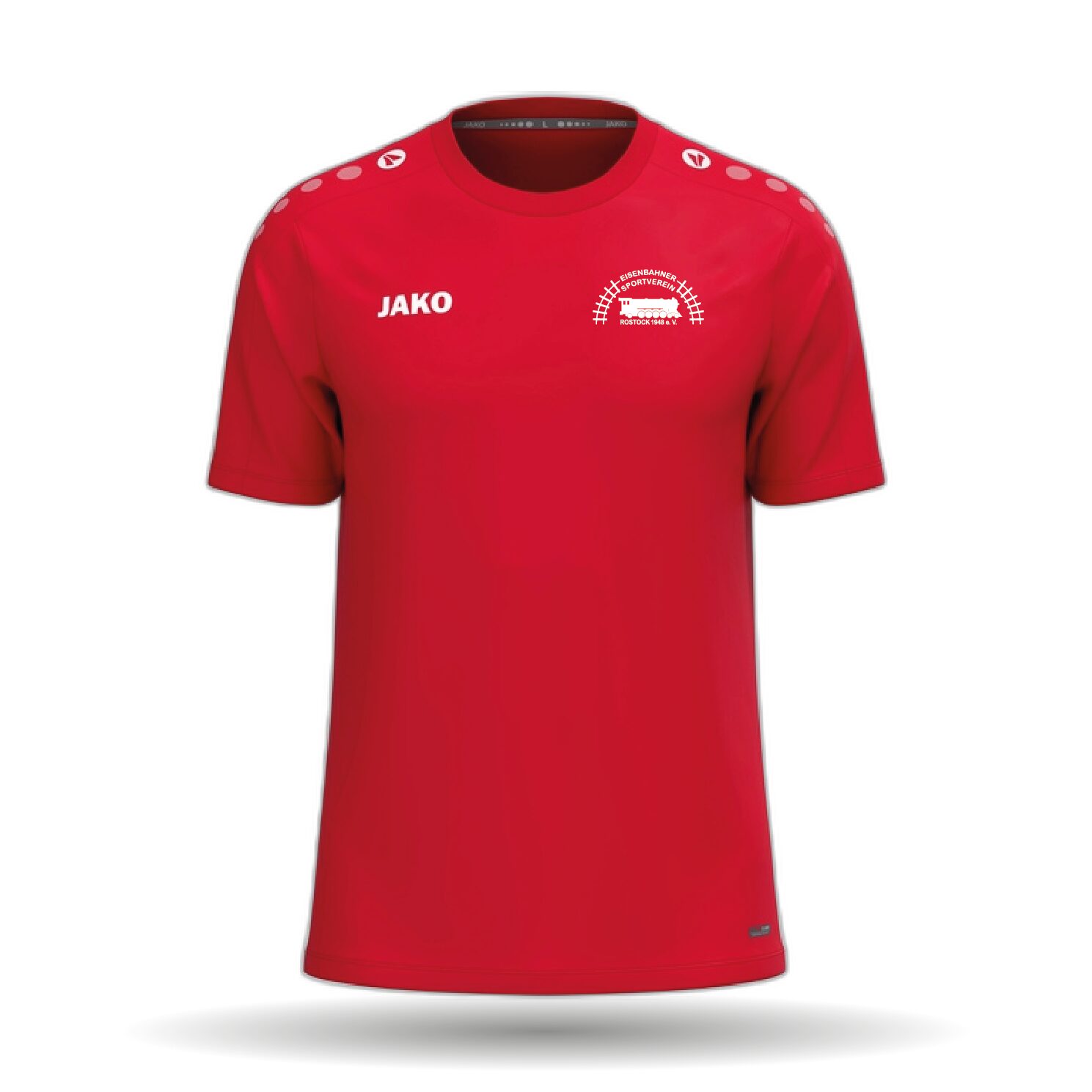 Das Trainings-T-Shirt ist in den Farben rot erhältlich. Es besitzt einen Rundhalskragen.