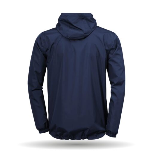 In der Farbe navy erhältlich. Die Regenjacke besitzt eine Kapuze mit Kordelzug. Außerdem besitzt sie 2 Seitentaschen mit Reißverschluss.