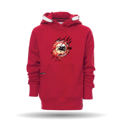 In der Farbe navy und rot erhältlich. Der Pullover ist mit einer Känguru Tasche und einer Reißverschlusstasche ausgestattet. Desweiteren besitzt er eine Kapuze mit Kordeln.