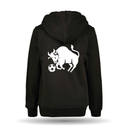 In der Farbe schwarz erhältlich. Der Pullover hat eine länger geschnittene Passform. Er besitzt eine gefütterte Kapuze sowie eine aufliegende Kängurutasche mit Taschenöffnungen. Am Ausschnitt befindet sich ein Nackenband.