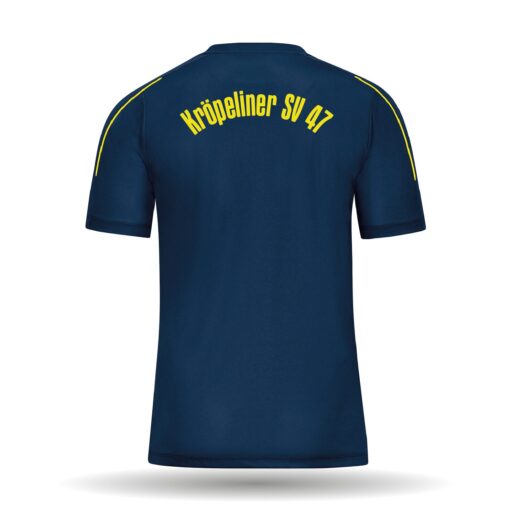 Das Trainingsshirt ist in der Farbe navy erhältlich. Es besitzt einen Rundhals-Rippkragen.