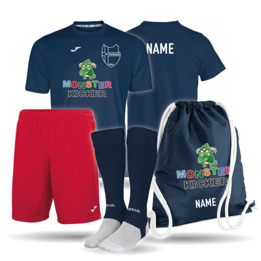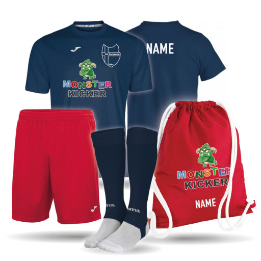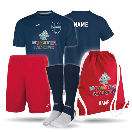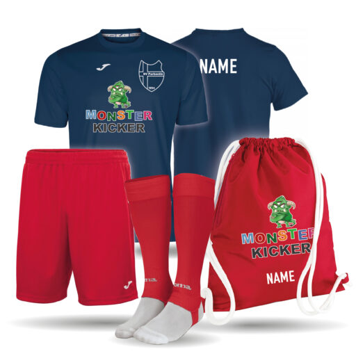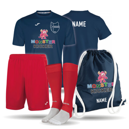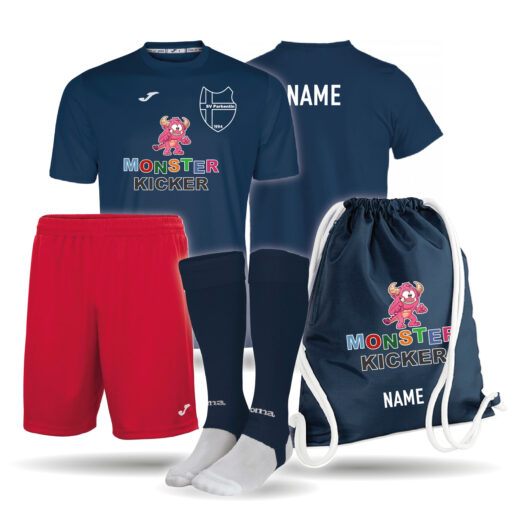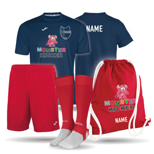 Einfarbiges Kinder Trikot mit einer kurzen Hose, Stutzen und einem hochwertigem Turnbeutel als Set. Mit dem Monsterkicker und SV Parkentin Logo auf der Vorderseite und den Namen des Kindes auf dem Rücken des Trikots, sowie auf dem Turnbeutel bedruckt. Der Turnbeutel ist in der Farbe navy und rot erhältlich. Außerdem ist dieser mit einer Reißverschluss-Tasche an der Seite ausgestattet. Das Trikot ist gerade geschnitten mit einem länger geschnittenem Rückenteil. Es besitzt einen gerippten V-Ausschnit. Dank Climacool besitzt das Trikot ein angenehm kühles und trockenes Tragegefühl.