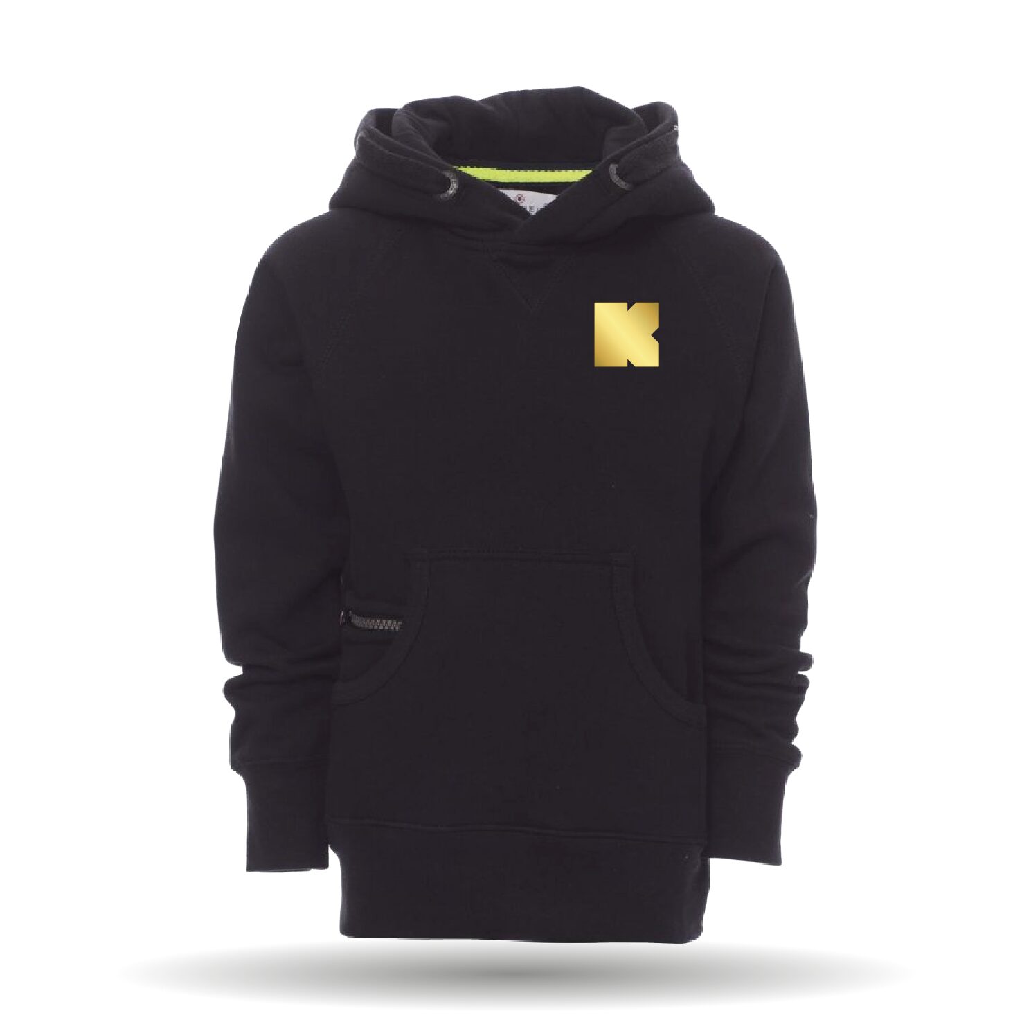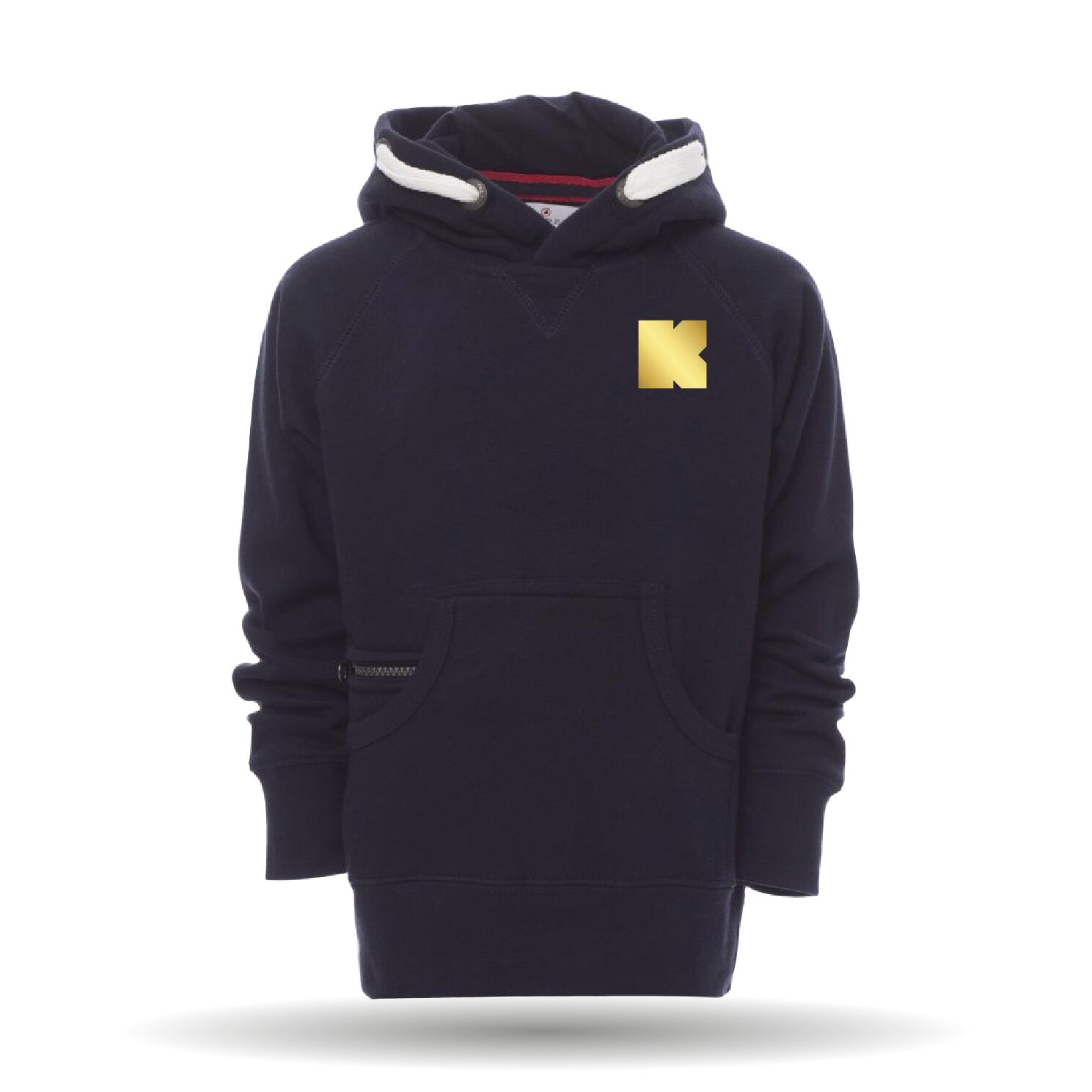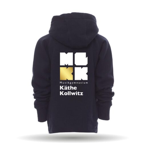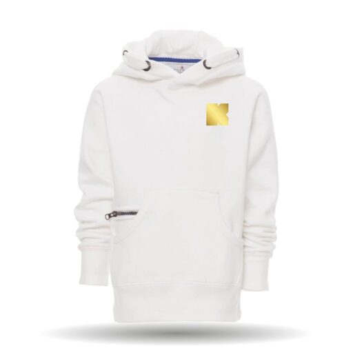 Dieser Hoodie ist in den Farben navy, schwarz, weiß erhältlich. Er besitzt eine Kapuze mit Kordeln. Des Weiteren ist es mit einer Kängurutasche, sowie eine Extra-Tasche mit Reißverschluss ausgestattet.