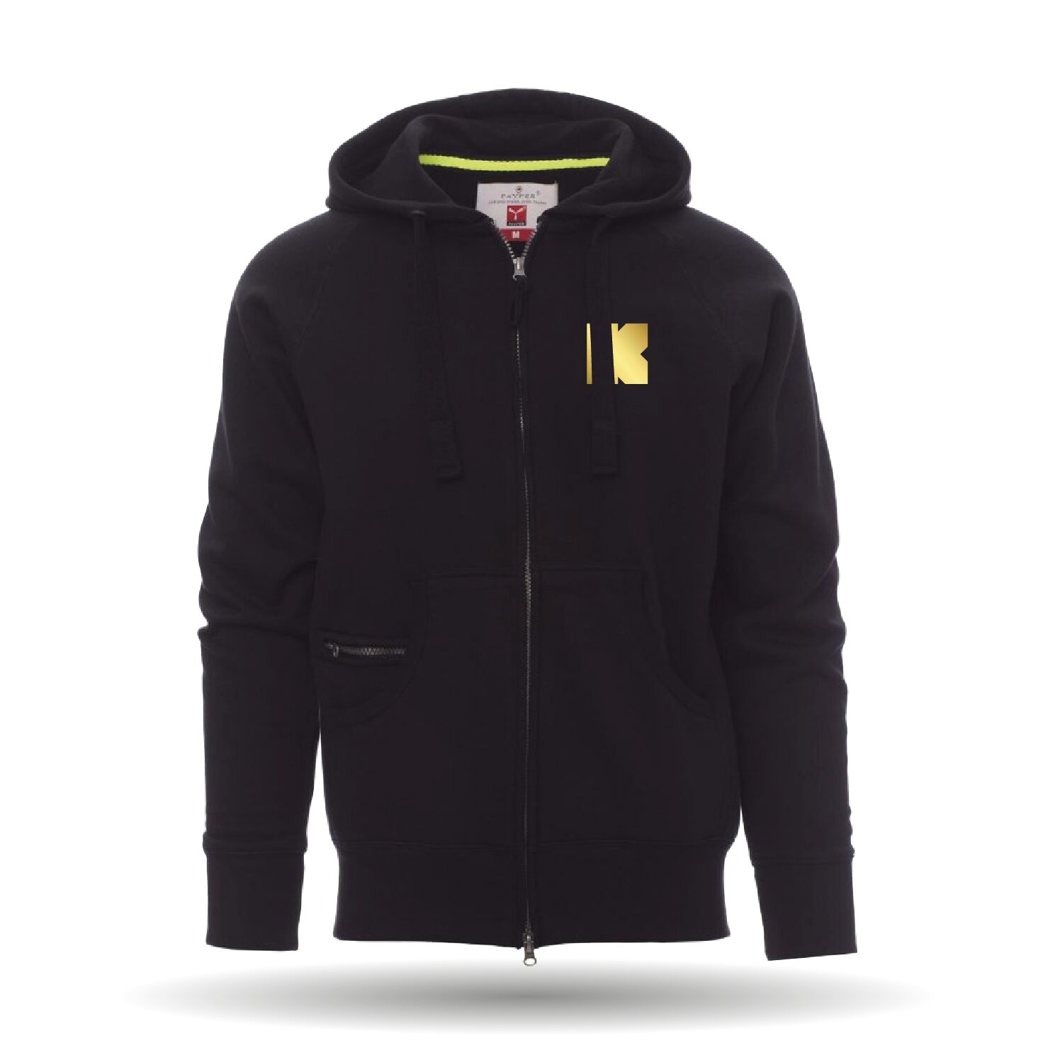 In der Farbe schwarz und navy erhältlich. Die Sweatjacke ist mit einer Extra-Reißverschlusstasche ausgestattet. Des weiteren besitzt er eine Kapuze mit Kordeln.