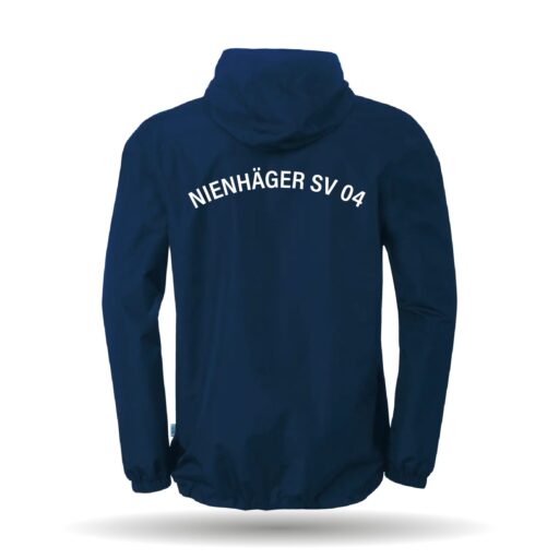 Die Regenjacke ist in den Farben navy erhältlich. Sie besitzt Seitentaschen mit Reißverschluss und eine Kapuze mit Kordelzug. Außerdem ist sie wasserabweisend.