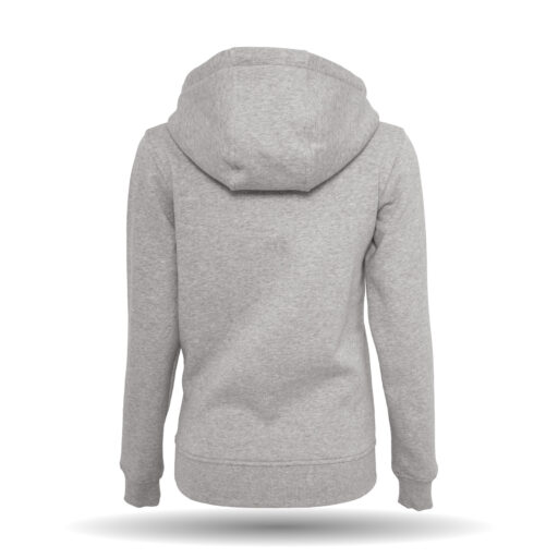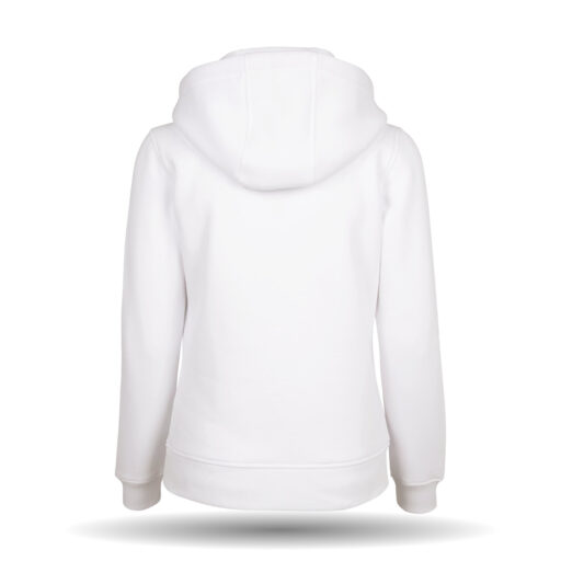 In der Farbe grau und weiß erhältlich. Der Pullover hat eine länger geschnittene Passform. Er besitzt eine gefütterte Kapuze sowie eine aufliegende Kängurutasche mit Taschenöffnungen. Am Ausschnitt befindet sich ein Nackenband.
