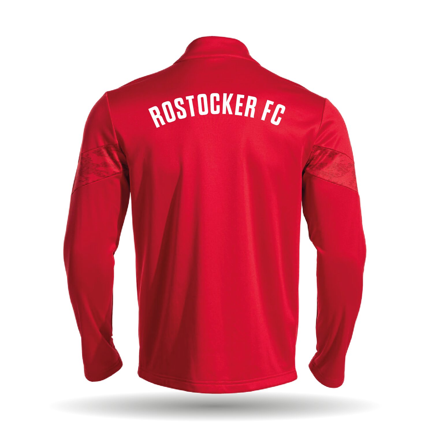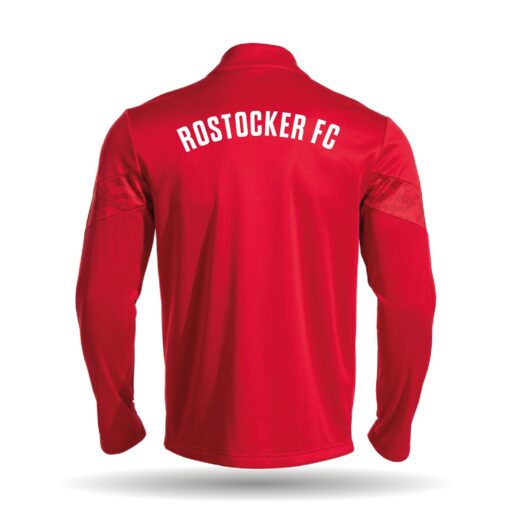 Das Zip-Top ist in der Farbe rot erhältlich. Es besitzt einen hohen Kragen mit Reißverschluss. Außerdem hat es eine Innenseite mit einer Fleece-Oberfläche.