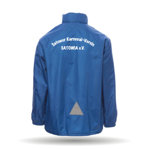 In der Farbe royal erhältlich. Die wasserdichte Jacke besitzt eine einrollbare Kapuze, sowie elastische Ärmelbündchen. Außerdem hat sie Taschen mit Klettverschluss.