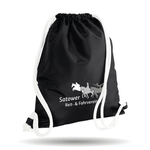 Einfarbiger Turnbeutel mit dem Satower Reit- und Fahrverein e. V. Logo. In der Farbe schwarz und orange erhältlich. Der große Turnbeutel ist mit einem Extrafach an der Seite versehen und besitzt große Zugbänder.