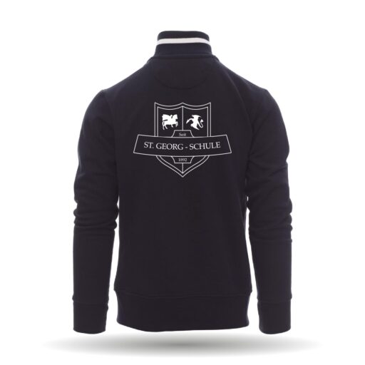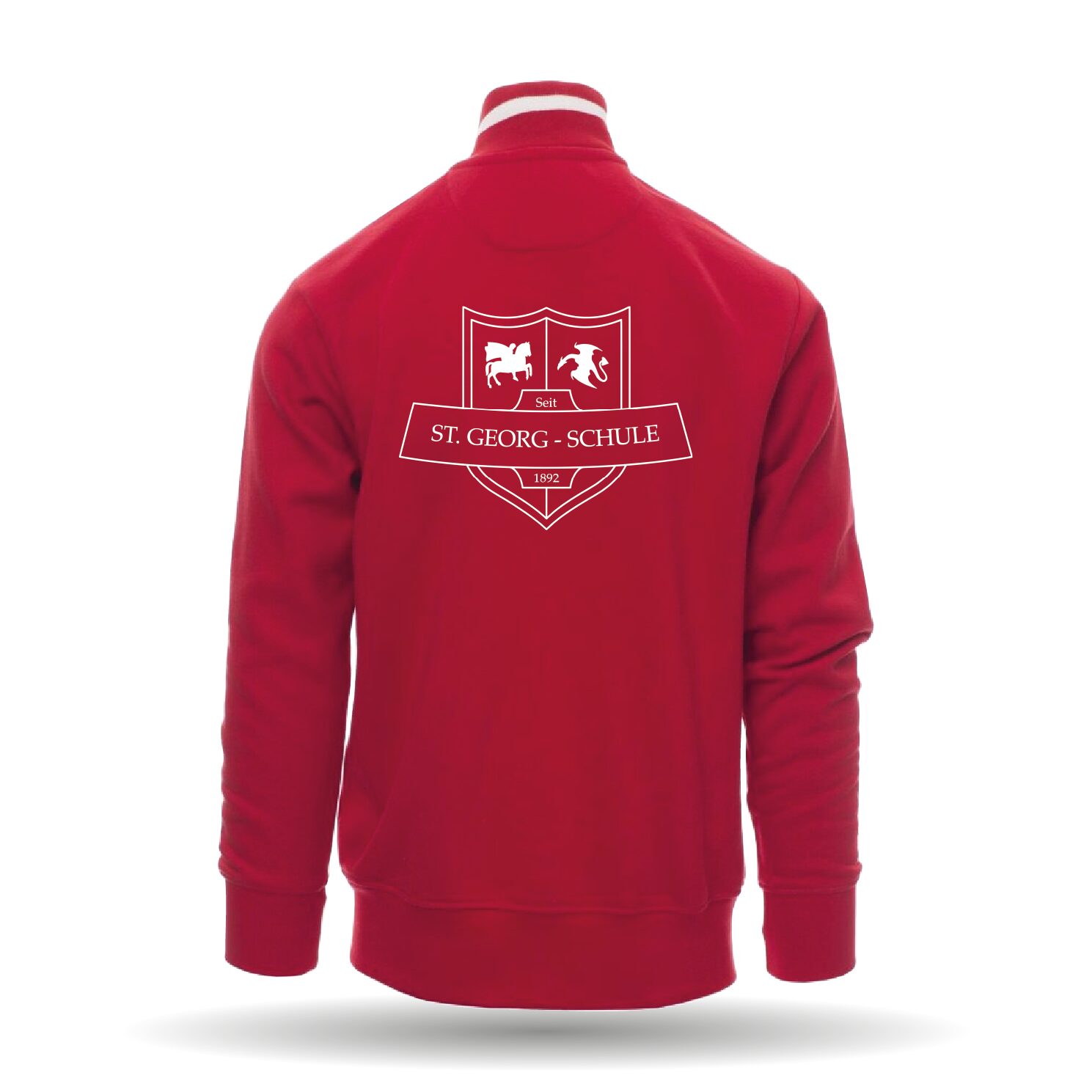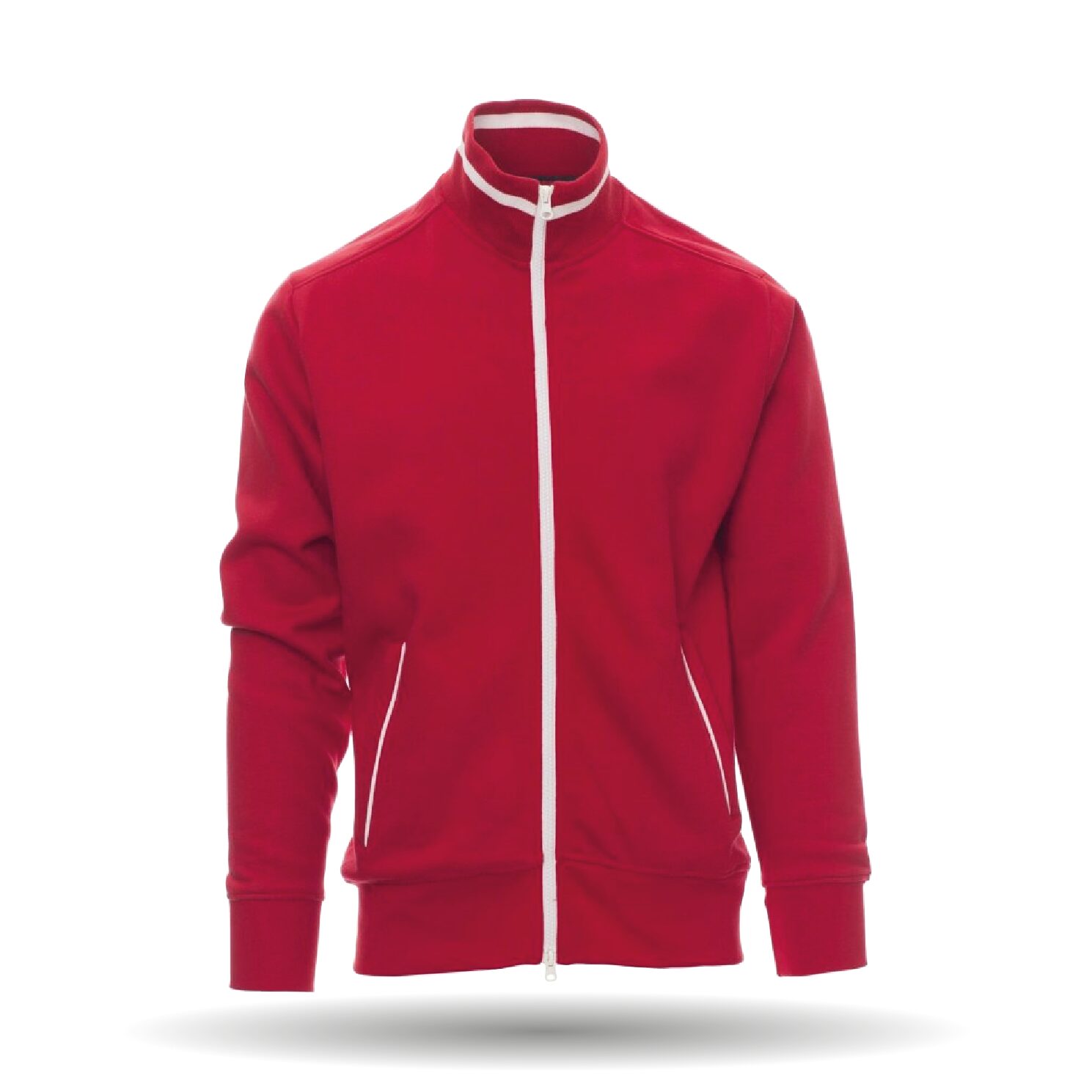 In der Farbe navy,rot erhältlich. Die Sweatjacke besitzt elastische Feinripp-Abschlüsse an Ärmeln und Taille. Außerdem besitzt sie 2 Außentaschen und ein Rippstrickkragen.