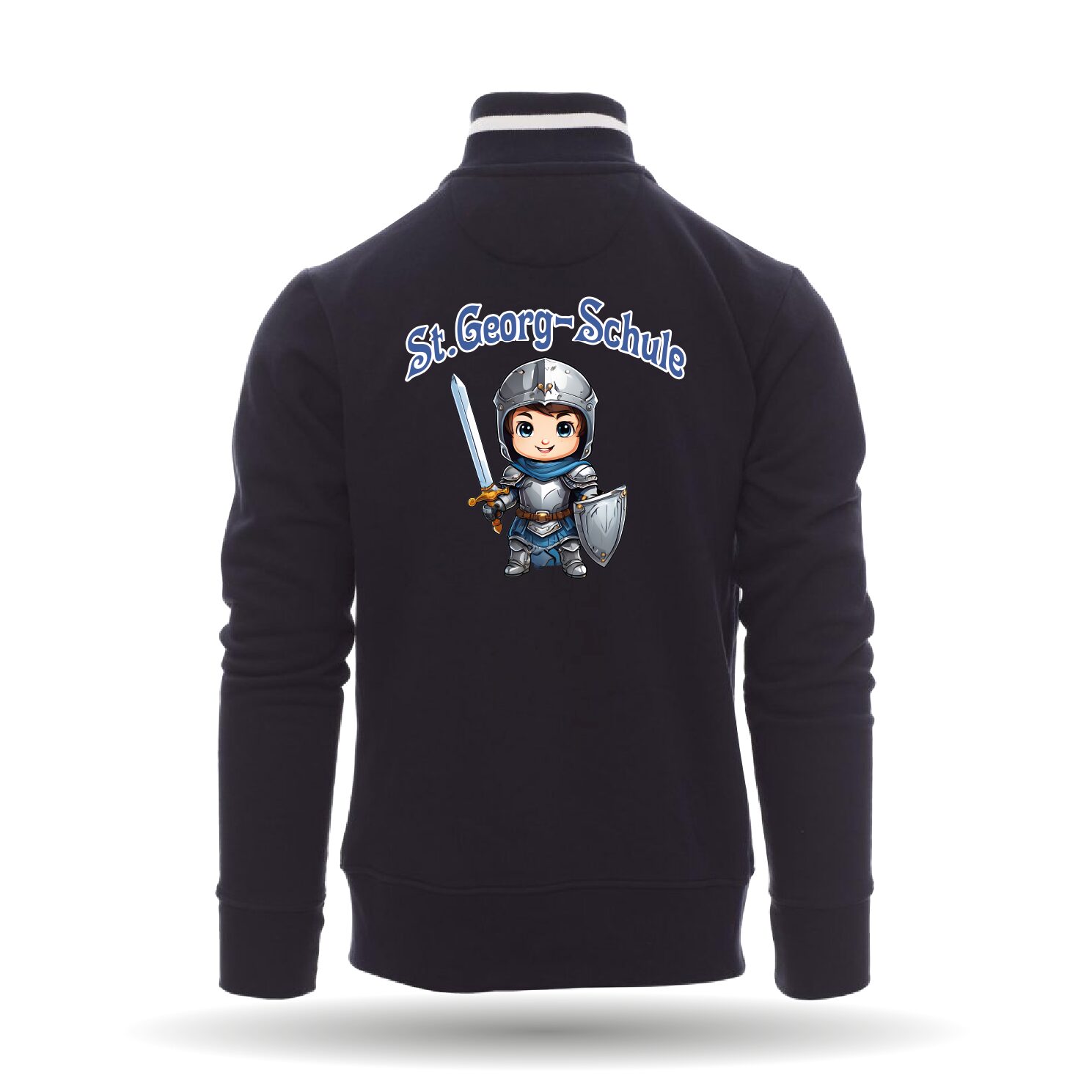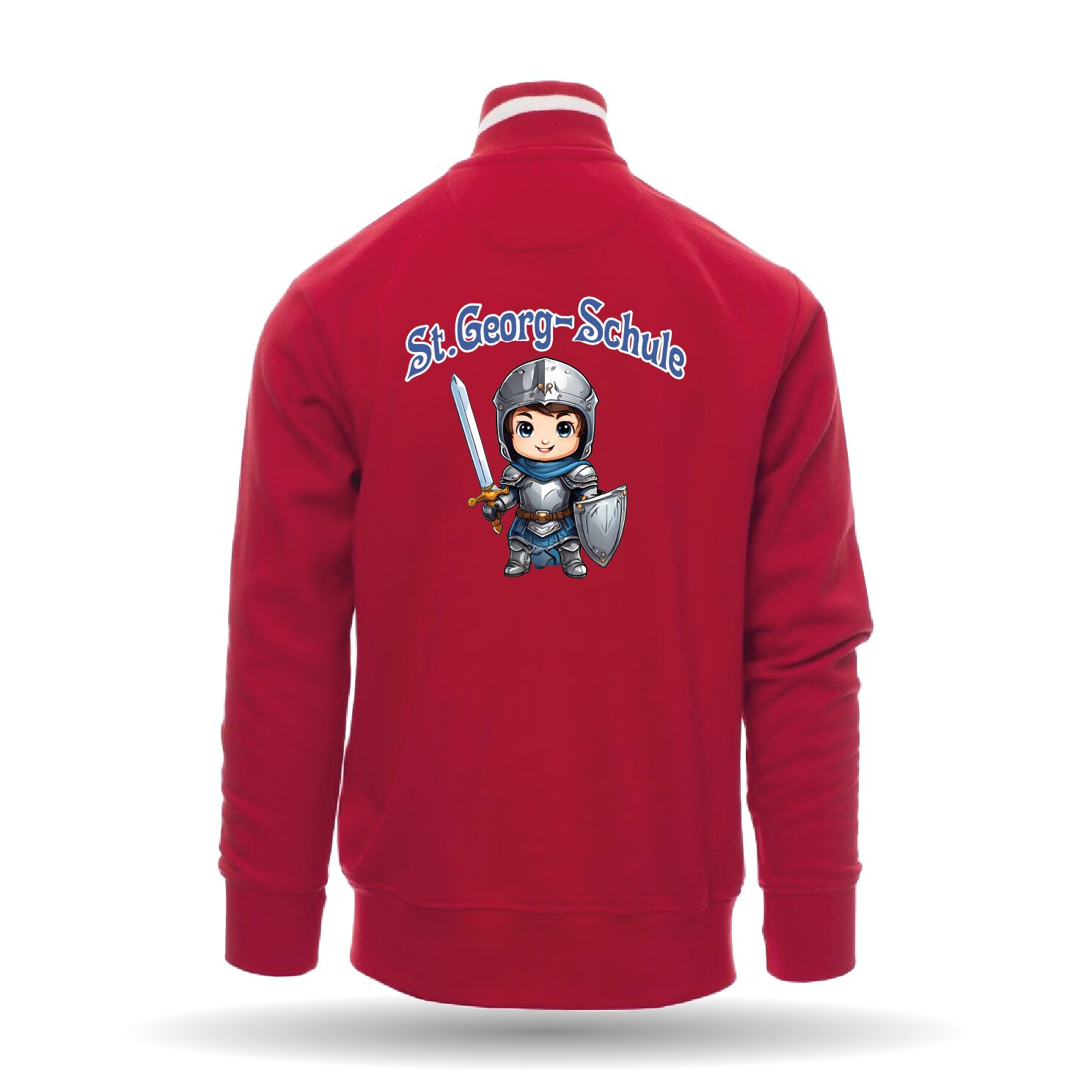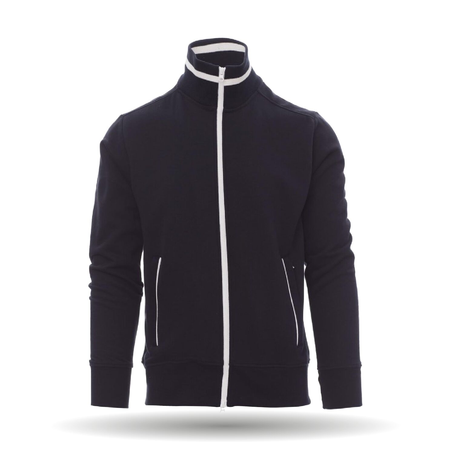 In der Farbe navy,rot erhältlich. Die Sweatjacke besitzt elastische Feinripp-Abschlüsse an Ärmeln und Taille. Außerdem besitzt sie 2 Außentaschen und ein Rippstrickkragen.