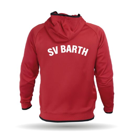 Der Hoodie ist in den Farben rot erhältlich. Er ist mit einer Kapuze mit flachen Kordeln und einer Kängurutasche ausgestattet. Außerdem hat er gerippte Bündchen und Saum, sowie eine reguläre Passform.