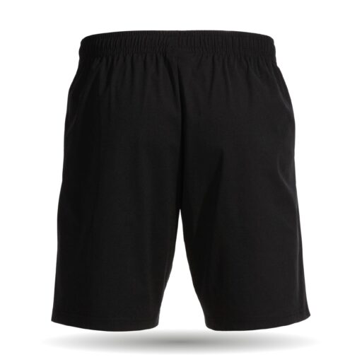 Die kurze Hose mit Taschen ist in den Farben schwarz erhältlich. Sie besitzt Taschen mit Reißverschlüssen sowie einen elastischen Bund mit Kordelzug.
