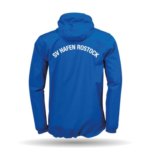 In der Farbe royal erhältlich. Die Regenjacke ist mit einem Stehkragen und mit einer versteckten Kapuze ausgestattet. Des weiteren besitzt sie elastische Ärmelbündchen und verstellbare Gummikordel mit Stoppen am Saum.