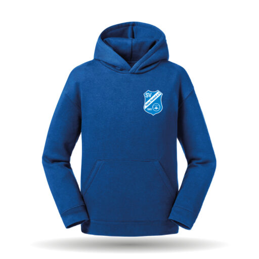 In der Farbe navy und royal erhältlich. Der Pullover hat eine länger geschnittene Passform. Er besitzt eine gefütterte Kapuze sowie eine aufliegende Kängurutasche mit Taschenöffnungen. Am Ausschnitt befindet sich ein Nackenband.