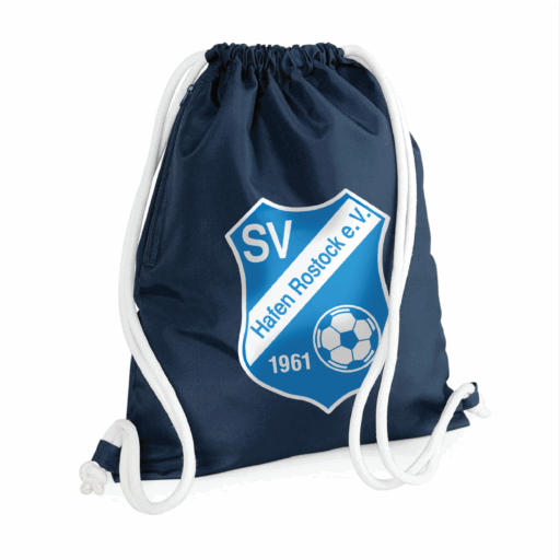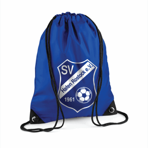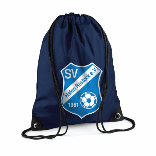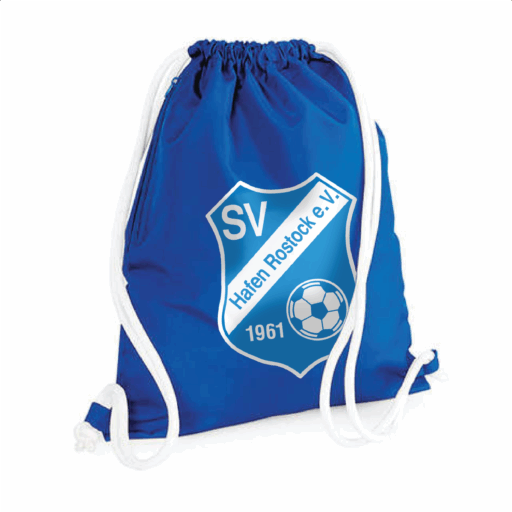 Einfarbiger Turnbeutel mit dem SV Hafen Rostock Logo. In der Farbe navy und royal erhältlich. Der große Turnbeutel ist mit einem Extrafach an der Seite versehen und besitzt große Zugbänder.
