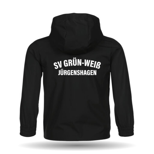 Die Allwetterjacke ist in der Farbe schwarz erhältlich. Sie besitzt Reißverschlusstaschen und elastische Bündchen.