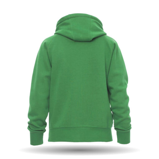 In der Farbe grün erhältlich. Der Pullover ist mit einer Känguru Tasche und einer Reißverschlusstasche ausgestattet. Desweiteren besitzt er eine Kapuze mit Kordeln.