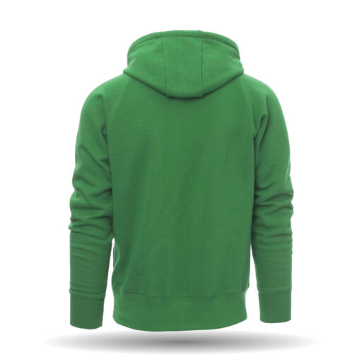 In der Farbe grün erhältlich. Der Pullover ist mit einer Känguru Tasche und einer Reißverschlusstasche ausgestattet. Desweiteren besitzt er eine Kapuze mit Kordeln.