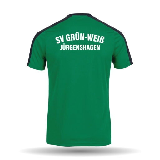 In der Farbe grün erhältlich. Das T-Shirt besitzt schwarze Schultern und ist mit einem Rundhalskragen ausgestattet.