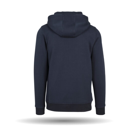 In der Farbe navy erhältlich. Der Pullover hat eine länger geschnittene Passform. Er besitzt eine gefütterte Kapuze sowie eine aufliegende Kängurutasche mit Taschenöffnungen. Am Ausschnitt befindet sich ein Nackenband.