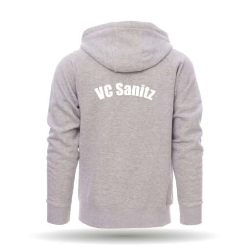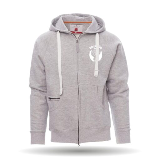 In der Farbe schwarz und grau erhältlich. Die Sweatjacke ist mit einer Extra-Reißverschlusstasche ausgestattet. Des weiteren besitzt er eine Kapuze mit Kordeln.